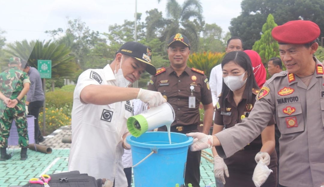 Bupati Pulang Pisau H. Ahmad Rifa’i menyaksikan langsung pemusnahan barang bukti narkotika di Kantor Kejaksaan Negeri Pulang Pisau, Rabu (25/6/2025).