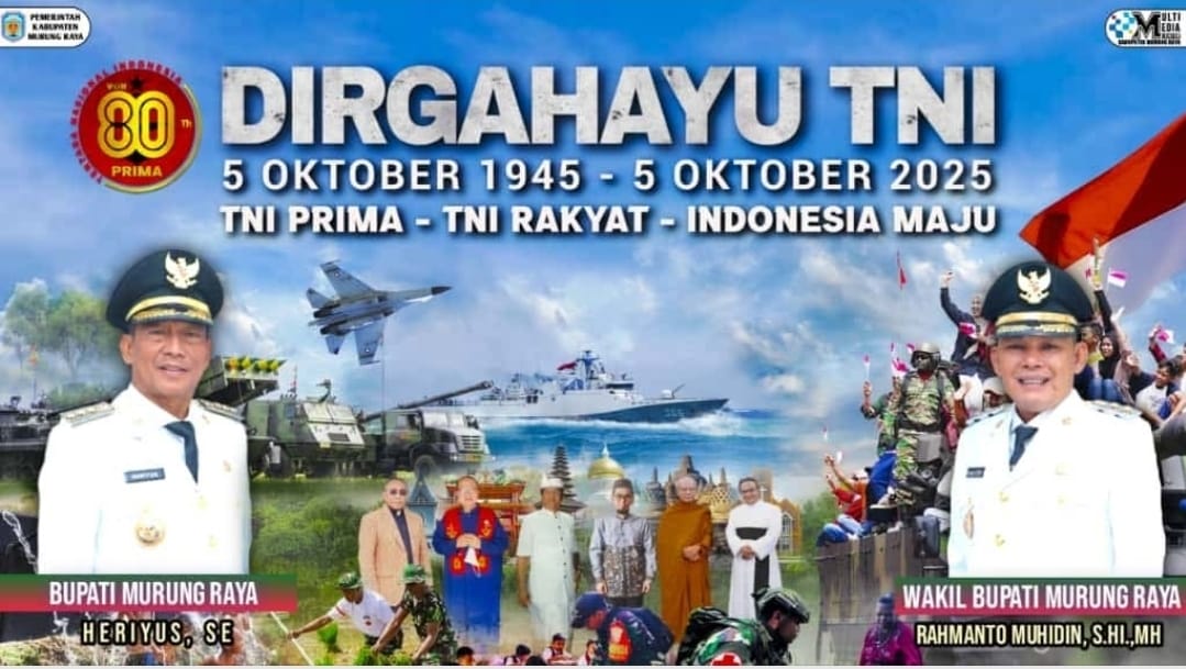 > “Atas nama Pemerintah Kabupaten Murung Raya, saya mengucapkan selamat HUT TNI ke-80 dengan tema ‘TNI Prima – TNI Rakyat – Indonesia Maju.’ Melalui tema tersebut, kami menyatakan dukungan penuh terhadap seluruh program dan kegiatan TNI yang senantiasa berorientasi pada pengabdian kepada rakyat,” ujar Bupati Heriyus.