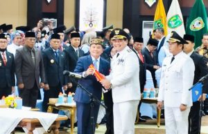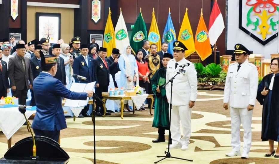 Gubernur H. Agustiar Sabran saat melantik pasangan H. Shalahuddin dan Felix Sonadie Y. Tingan sebagai Bupati dan Wakil Bupati Barito Utara Masa Jabatan 2025–2030