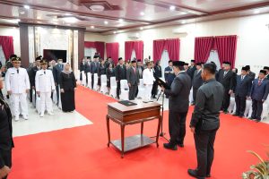 PALANGKANEWS.CO.ID – LAMANDAU | Suasana ruang Aula Setda Lamandau, Kamis malam (23/10/2025), terasa khidmat namun penuh semangat baru. Bupati Lamandau Rizky Aditya Putra, S.E., M.M. memimpin langsung pelantikan dan pengambilan sumpah jabatan 33 pejabat administrator dan pengawas di lingkungan Pemerintah Kabupaten Lamandau.