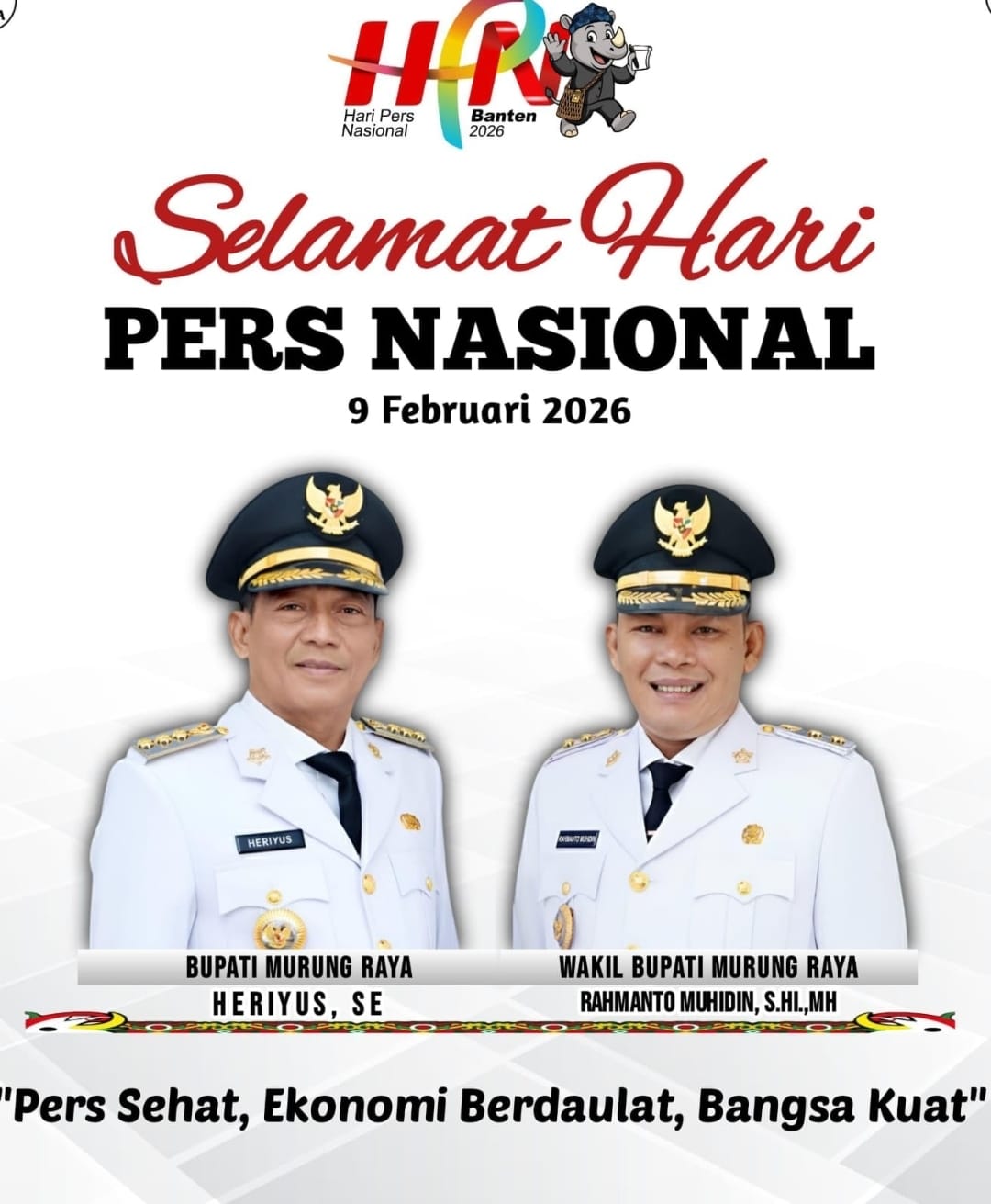 PALANGKA-NEWS .CO.ID MURUNG RAYA – Bupati Kabupaten Murung Raya, Heriyus, bersama Wakil Bupati Rahmanto Muhidin, menyampaikan ucapan Selamat Hari Pers Nasional (HPN) Tahun 2026 yang diperingati pada Senin, 9 Februari 2026. Ucapan tersebut ditujukan kepada seluruh insan pers, khususnya yang bertugas di wilayah Kabupaten Murung Raya.