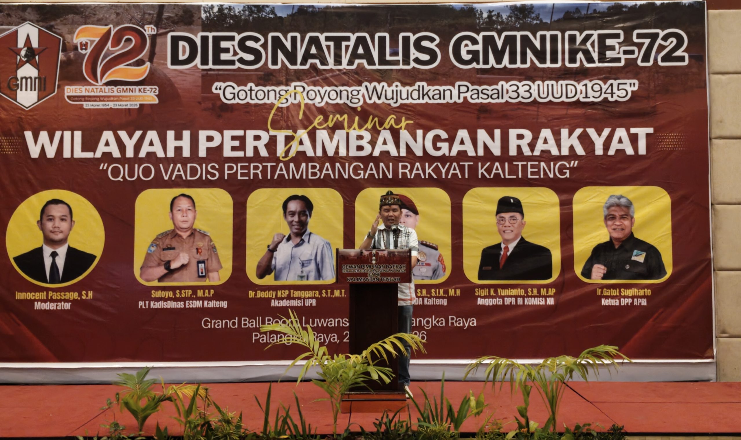 PALANGKA-NEWS.CO.ID, PALANGKA RAYA – Peringatan Dies Natalis GMNI ke-72 di Kalimantan Tengah menjadi momentum penting dalam memperkuat semangat gotong royong, khususnya dalam mendorong implementasi Pasal 33 UUD 1945 melalui seminar Wilayah Pertambangan Rakyat (WPR). 28/3)2026.